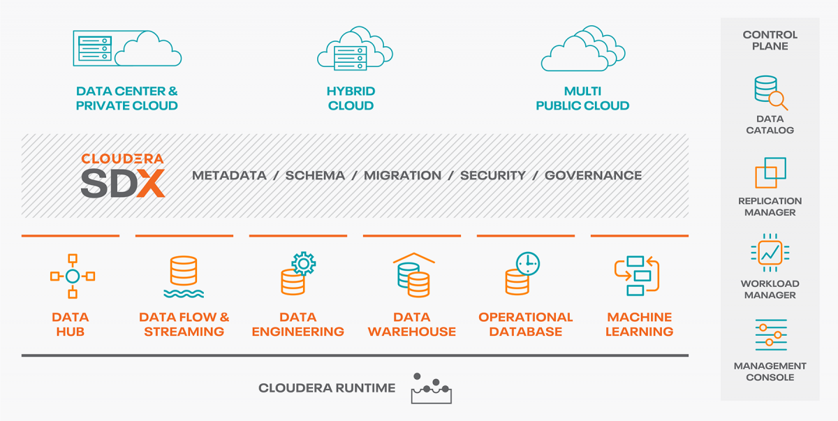 The Cloudera Data Platform (CDP) manages and secures the data lifecycle across all major public clouds and the private cloud, seamlessly connecting on-premises environments to public clouds for a hybrid data cloud experience. CDP Enables you to: